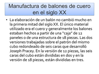 El documento describe la evolución de la fabricación de balones de cuero en el siglo XX. Inicialmente, los balones se fabricaban a mano con cuero en patrones de 12 o 18 piezas. En la década de 1920, se empezaron a usar telas para reforzar el cuero. En la década de 1930, se desarrollaron máquinas cortadoras para acelerar y uniformizar el proceso de corte de las piezas de cuero, aunque la costura seguía siendo manual.
