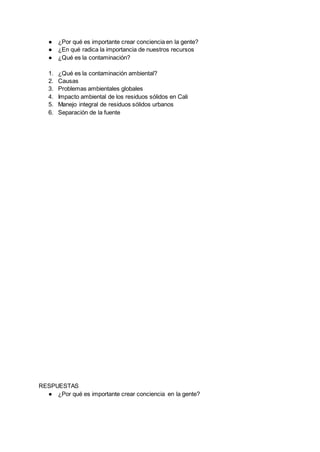 Este documento presenta un proyecto sobre la contaminación ambiental causada por el mal manejo de basuras y residuos sólidos en la ciudad de Cali. Explica la importancia de crear conciencia ambiental en la gente y el impacto de los residuos sólidos en Cali. También describe las causas de la contaminación ambiental, los problemas ambientales globales, y la importancia del manejo integral de residuos sólidos y la separación de basuras en la fuente.