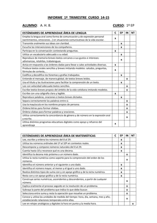 Este informe trimestral evalúa el progreso académico y las habilidades de un estudiante de primer grado de primaria. El estudiante ha demostrado un buen dominio de las áreas de lengua y matemáticas, y ha mejorado sus habilidades sociales, de atención y autoestima. La maestra nota una evolución positiva en los aprendizajes del estudiante y una mejora en su expresión oral y comportamiento desde el año pasado.