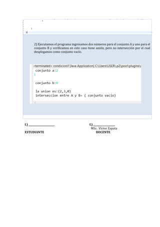 Este documento presenta una guía para una práctica de laboratorio sobre la unión e intersección de conjuntos. El objetivo es conocer el uso de los operadores lógicos AND y OR. Las actividades incluyen crear un programa que permite ingresar dos conjuntos y mostrar su unión, intersección o conjunto vacío. El desarrollo explica cómo crear variables para los conjuntos, verificar la unión e intersección usando sentencias if y operadores lógicos, y ejecutar el programa con ejemplos.