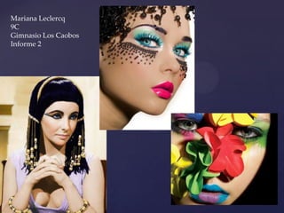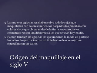 El documento resume la historia del maquillaje desde el antiguo Egipto hasta la actualidad. Las mujeres egipcias se maquillaban los ojos y labios con colores de la tierra. En Grecia y Roma, las mujeres blanqueaban la piel con yeso. En el siglo XIX surgió el rojo de labios y en el siglo XX la industrialización permitió corregir imperfecciones y destacar la belleza de manera más efectiva.