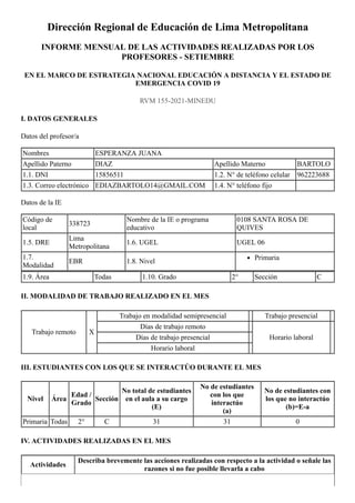 El informe describe las actividades realizadas por la profesora Esperanza Díaz durante setiembre en la escuela primaria Santa Rosa de Quives. La profesora enseñó de forma remota a 31 estudiantes de segundo grado, desarrollando experiencias de aprendizaje sobre nutrición y tecnología de comunicación. Realizó tutorías, evaluaciones formativas y reuniones de trabajo colaborativo con otros docentes para mejorar la enseñanza remota.