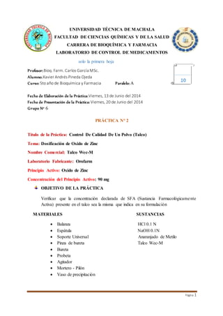 Este documento presenta los resultados de un experimento de laboratorio para verificar la concentración declarada de óxido de zinc en un polvo (talco) mediante titulación ácido-base. El resumen experimental muestra que la concentración de óxido de zinc medida fue de 92.30%, lo cual está dentro de los parámetros establecidos entre 90-110%.
