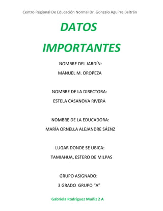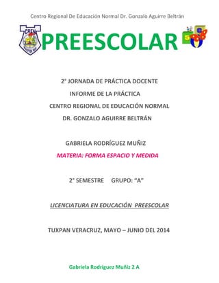 Este documento presenta los informes de la segunda jornada de práctica docente de Gabriela Rodríguez Muñiz en el Centro Regional de Educación Normal Dr. Gonzalo Aguirre Beltrán. Incluye detalles sobre el jardín de niños donde realizó la práctica, como el nombre de la directora y maestra guía. También describe las actividades planeadas para trabajar conceptos de forma, espacio y medida con niños de 3er grado, así como los indicadores de evaluación y el desarrollo de las actividades en clase.