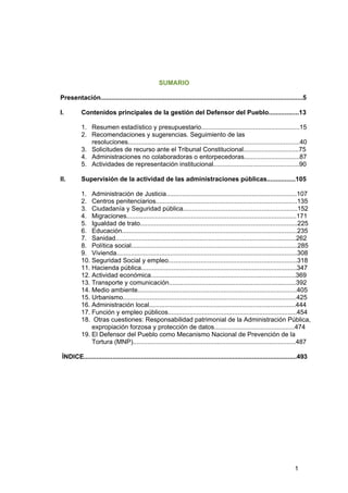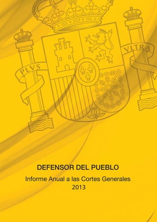 Este documento presenta el informe anual 2013 del Defensor del Pueblo de España. El informe describe las principales actuaciones de la institución, incluyendo estadísticas sobre quejas recibidas, recomendaciones a las administraciones públicas, solicitudes de recursos de inconstitucionalidad, y actividades de representación institucional. También incluye un análisis de la supervisión de diferentes áreas de las administraciones públicas como justicia, educación, sanidad, política social y vivienda.
