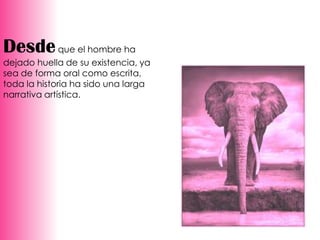 La fotografía y la literatura han sido las principales formas de narrar la historia durante los últimos cien años, aunque recientemente el cine y el video han ganado prominencia. El documento argumenta que la fotografía tiene un gran poder narrativo para contar historias, aunque se requiere más que habilidad fotográfica para usar imágenes y narrar efectivamente.
