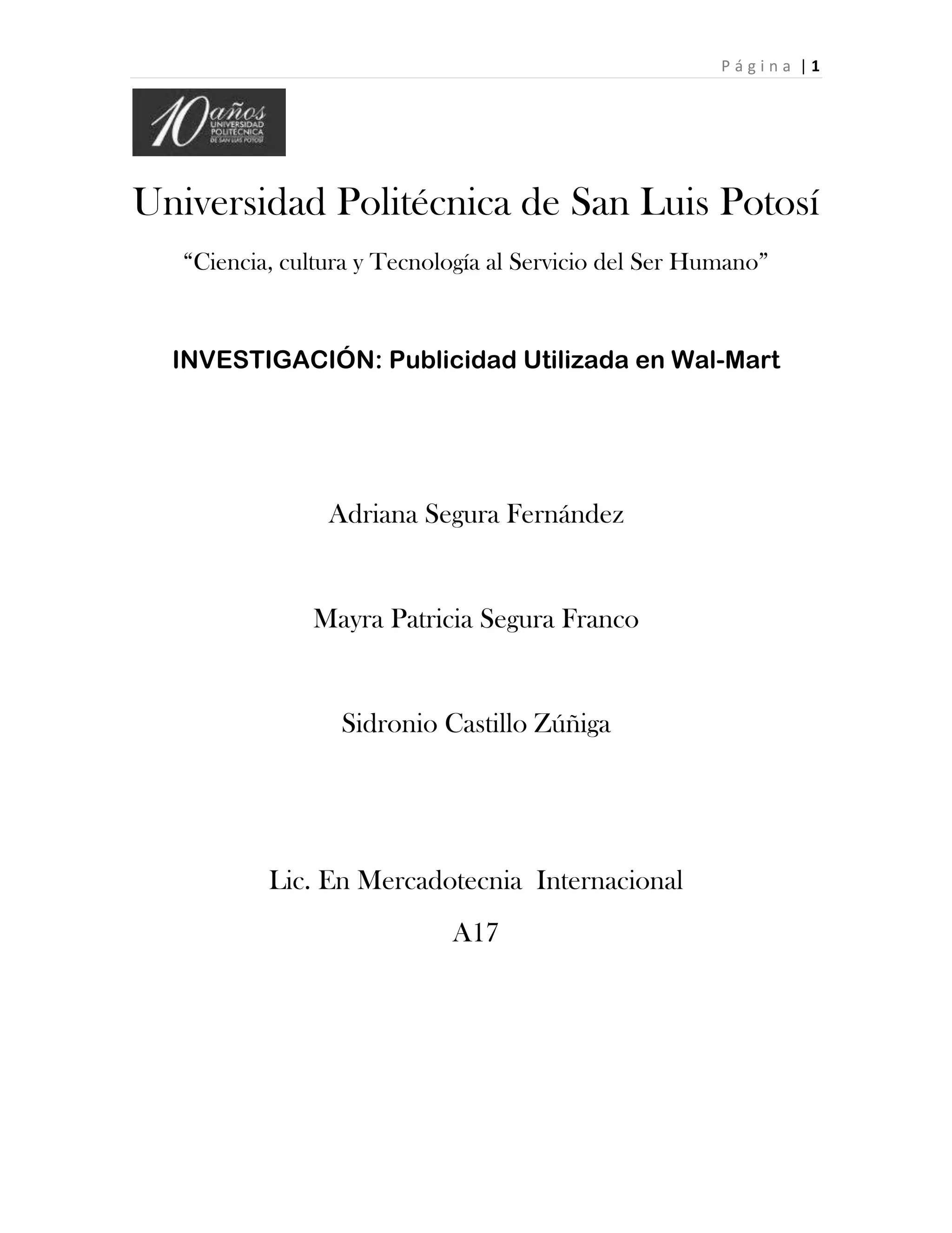 Este documento describe una investigación sobre la publicidad utilizada por Wal-Mart en San Luis Potosí, México. Analiza los medios publicitarios como la televisión, radio, publicidad exterior e internet que usa Wal-Mart para posicionarse en el mercado. Realizó 400 encuestas a clientes y consultó a profesores de mercadotecnia. Los hallazgos sugieren que los medios masivos ayudan a Wal-Mart a tener impacto en la sociedad y ser uno de los favoritos en el mercado.