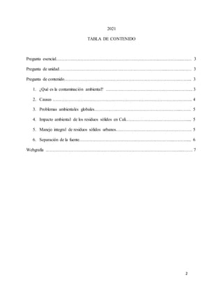 La contaminación ambiental causada por el mal manejo de residuos sólidos en Cali es un problema importante que afecta la biodiversidad y la salud. La ciudad genera una gran cantidad de basura que no se maneja de forma integral, como la separación en la fuente. Es necesario crear conciencia en la gente sobre el impacto de los desechos y la importancia de su disposición adecuada para reducir la contaminación y extender la vida útil de los rellenos sanitarios.