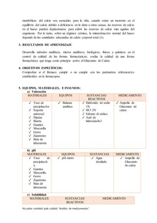 Este documento describe un análisis de calidad de una forma farmacéutica líquida que contiene gluconato de calcio al 10%. Se realizaron diversos análisis como valoración, pH, solubilidad, refractometría, contenido extraíble, aspecto de la disolución, características organolépticas, densidad, límite de cloruros y microscopía. Los resultados obtenidos indican que la muestra cumple con los parámetros de referencia establecidos para la mayoría de análisis, excepto en el límite