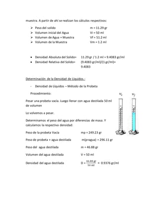 Este informe presenta diferentes métodos para determinar la densidad de sustancias sólidas y líquidas, como el método de la probeta y el picnómetro. Explica que la densidad es la masa por unidad de volumen y depende de factores como la temperatura. Incluye cálculos de densidad realizados para muestras como el hierro y el etanol usando ambos métodos. Finalmente, concluye que los resultados obtenidos fueron aproximados pero precisos, y que el manejo adecuado de equipos es necesario para minimizar errores