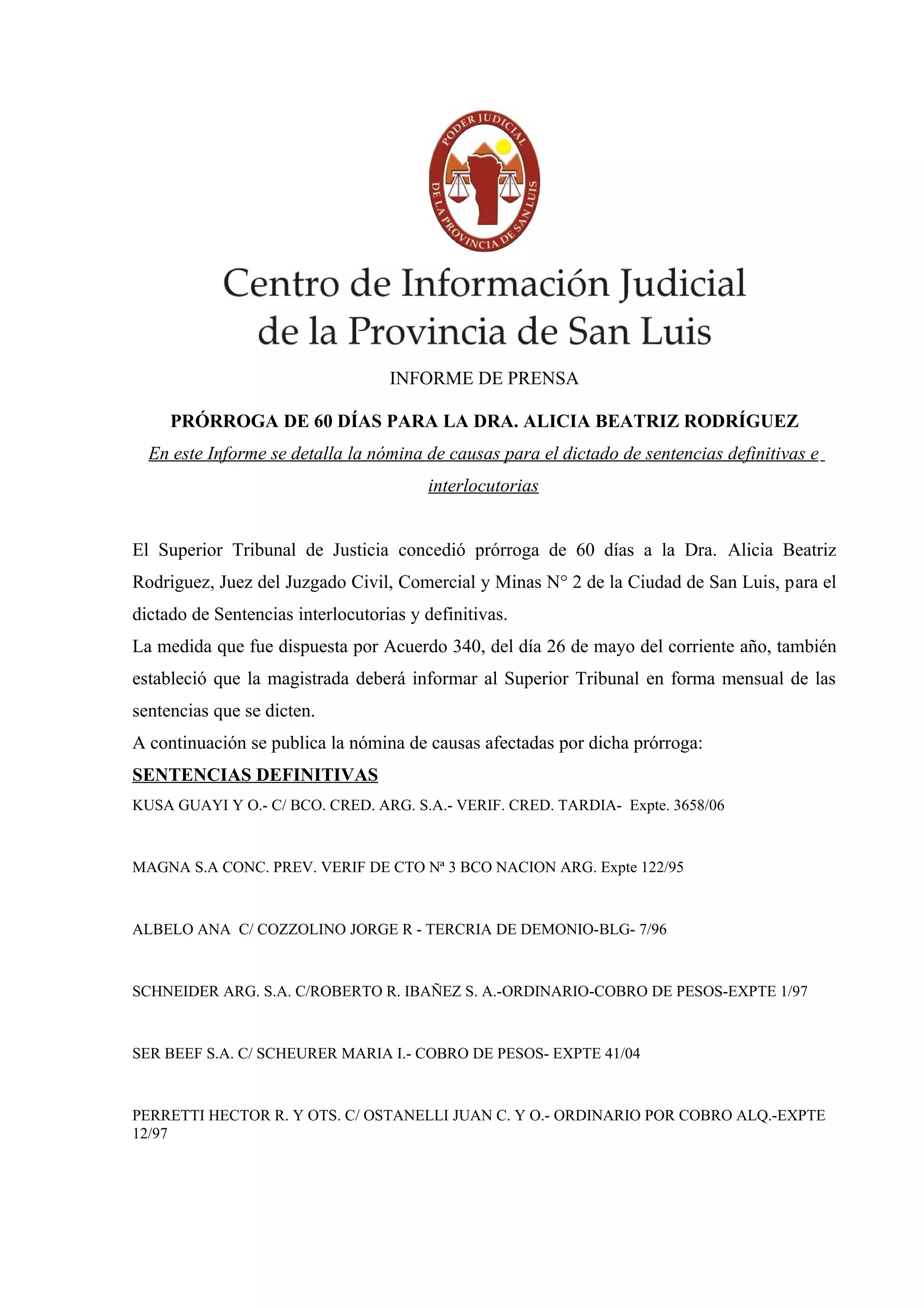 El Superior Tribunal de Justicia de la provincia de San Luis concedió una prórroga de 60 días a la Dra. Alicia Beatriz Rodríguez, jueza del Juzgado Civil, Comercial y Minas N° 2 de la ciudad de San Luis, para dictar sentencias interlocutorias y definitivas en las causas listadas. La medida también establece que la magistrada deberá informar mensualmente al Tribunal sobre las sentencias dictadas. La nómina incluye causas con sentencias definitivas e interlocutorias pendientes.