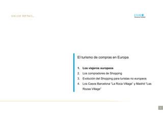 Este documento analiza el turismo de compras en Europa, centrándose en los centros comerciales de outlet Value Retail. Presenta datos sobre el perfil de los compradores, incluyendo su edad, género, país de origen, gasto medio y actividades preferidas en cinco ciudades europeas. También examina el crecimiento de las ventas en estos centros comerciales en comparación con las ciudades anfitrionas y destaca los casos de éxito de "La Roca Village" en Barcelona y "Las Rozas Village" en Madrid.