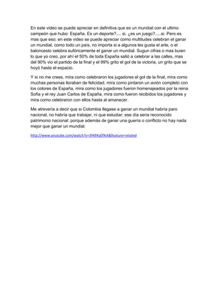 Este documento describe cómo España celebró eufóricamente la victoria en la Copa Mundial de Fútbol de 2010, con multitudes saliendo a las calles, más del 90% de la población viendo el partido final y el 99% gritando el gol ganador. También sugiere que si Colombia ganara una Copa del Mundo, habría un paro nacional para celebrar, ya que nada une más a un país que ganar el campeonato mundial de fútbol.