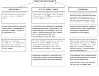 El documento describe los orígenes de la Copa Mundial de Fútbol. La FIFA propuso originalmente un torneo mundial en la década de 1920 pero no se pudo realizar debido a falta de fondos e infraestructura. Finalmente, en 1930 se llevó a cabo la primera Copa Mundial en Uruguay con solo 13 equipos participantes, ganando Uruguay sobre Argentina en la final ante 90,000 espectadores.