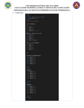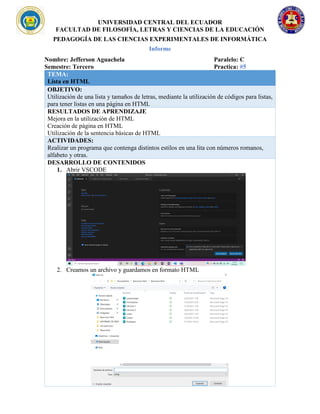 El documento describe un informe sobre la creación de listas en HTML. El estudiante Jefferson Aguachela realizó una práctica para mejorar su conocimiento de HTML mediante la creación de una página que contiene diferentes estilos de lista con números romanos, alfabeto y otros elementos. El estudiante abrió un archivo en VSCode, codificó la página HTML y depuró y ejecutó el código para verificar que funcionara correctamente.