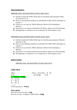 Este documento describe una práctica de laboratorio en la que una estudiante preparó soluciones normales y molares de CuSO4.5H2O. La estudiante calculó las cantidades necesarias de CuSO4.5H2O para preparar soluciones de 0.1 N y 0.1 M, pesó los reactivos, disolvió y aforó las soluciones, y anotó los resultados. El documento también incluye la teoría sobre soluciones normales y molares.