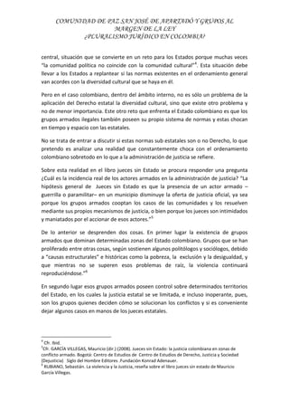 El documento describe dos ejemplos de pluralismo jurídico en Colombia. Primero, la existencia de grupos armados ilegales que controlan territorios y aplican su propio sistema de normas, limitando la justicia estatal. Segundo, la Comunidad de Paz de San José de Apartadó, que se rige por su propio reglamento interno y rechaza las normas de grupos armados y del Estado colombiano, lo que ha generado ataques en su contra. El documento analiza cómo estas realidades desafían el monopolio normativo del Estado colombiano.