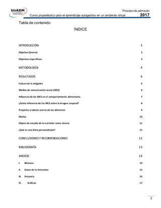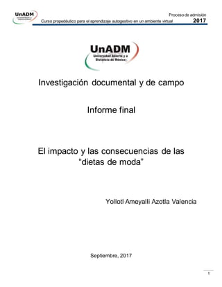 Este documento presenta una investigación sobre el impacto y consecuencias de las "dietas de moda". Describe la metodología utilizada, que incluyó investigación documental, entrevistas y encuestas. Los resultados discuten temas como la cultura de la delgadez, la influencia de los medios de comunicación en la imagen corporal y los comportamientos alimenticios, y los prejuicios relacionados con los alimentos y las dietas. Finalmente, concluye que las dietas de moda ponen en riesgo la salud y carecen de fundamentos nutricional