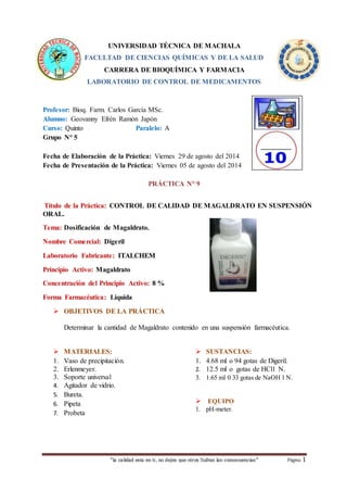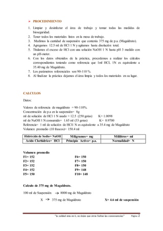 Este documento presenta los resultados de un análisis de calidad de un medicamento líquido con magaldrato como principio activo. El resumen incluye que el porcentaje real de magaldrato encontrado fue de 104%, dentro de los parámetros de referencia. Adicionalmente, se describen los objetivos, materiales, procedimiento y cálculos realizados para la determinación del principio activo.