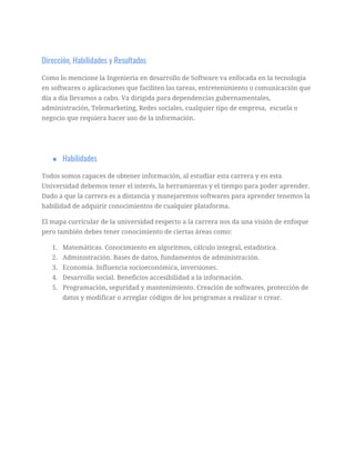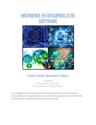 Este documento describe la carrera de Ingeniería en Desarrollo de Software. Explica que esta carrera se enfoca en crear software y aplicaciones que faciliten tareas, entretenimiento y comunicación. También describe habilidades requeridas como matemáticas, programación y administración de bases de datos. Finalmente, menciona que los profesionales en esta área pueden crear software para sectores como el gobierno, empresas y educación con el objetivo de mejorar la accesibilidad de la información.