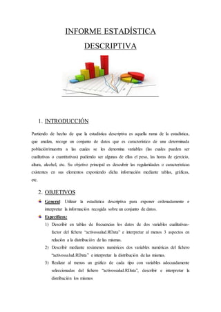 Este documento presenta un informe sobre estadística descriptiva. Describe la metodología utilizada para analizar variables cualitativas y cuantitativas de una muestra de 291 personas. Los resultados incluyen tablas de frecuencias que resumen dos variables cualitativas, estadísticos descriptivos como la media y los cuartiles para dos variables cuantitativas, y gráficos que representan la distribución de cuatro variables. Las conclusiones destacan aspectos como la alta frecuencia de no fumar y la distribución de peso que sigue una curva