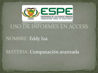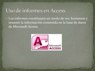 Este documento describe el uso de informes en Microsoft Access. Los informes permiten presentar la información de una base de datos de manera ordenada y formato. Pueden usarse para mostrar resúmenes de datos, archivar instantáneas, proveer detalles de registros individuales y crear etiquetas. Para crear un informe, se selecciona un objeto como una tabla o consulta y luego se genera el informe. Los campos pueden ajustarse de tamaño y el informe puede ordenarse y filtrarse como otros objetos de Access.