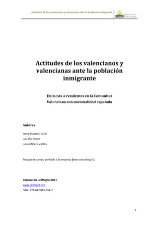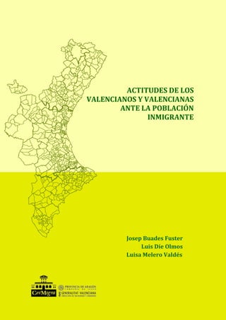 Este documento presenta los resultados de una encuesta realizada en la Comunidad Valenciana sobre las actitudes de los valencianos hacia la población inmigrante. La encuesta analiza diversos aspectos como la percepción sobre el volumen de población inmigrante, las razones de los flujos migratorios, la valoración de las aportaciones de los inmigrantes, las opiniones sobre los derechos de los inmigrantes y sobre su integración. El documento incluye tablas detalladas con los resultados y conclusiones sobre las actitudes mayoritariamente posit