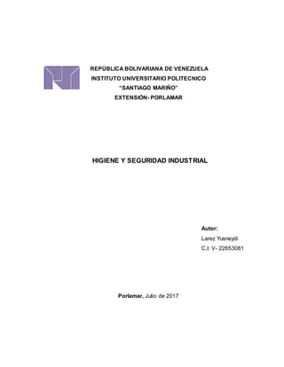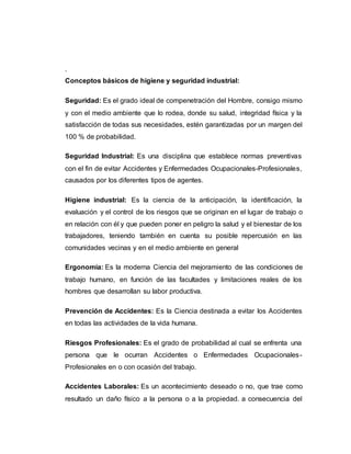 Este documento presenta conceptos básicos sobre higiene y seguridad industrial. Define términos como seguridad, riesgos profesionales, accidentes laborales, enfermedades ocupacionales, y clasifica los contaminantes higiénicos en agentes químicos, físicos y biológicos. También describe los objetivos de la higiene y seguridad industrial, que incluyen evitar lesiones y muertes por accidentes, reducir costos operativos, mejorar la calidad de vida del trabajador y la imagen de la organización, y cont