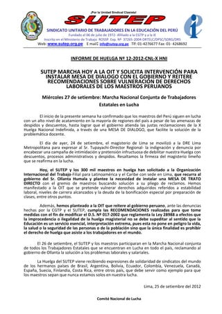 El SUTE registra una fuerte movilización de maestros en huelga en Perú, convocando a la Organización Internacional del Trabajo para solicitar la instalación de una mesa de diálogo con el gobierno. A pesar de las amenazas de despidos y descuentos, los docentes se mantienen firmes en sus demandas por la defensa de sus derechos laborales y mejoras salariales. La huelga ha recibido apoyo internacional de sindicatos de diversos países, evidenciando la solidaridad en la lucha por los derechos de los trabajadores.