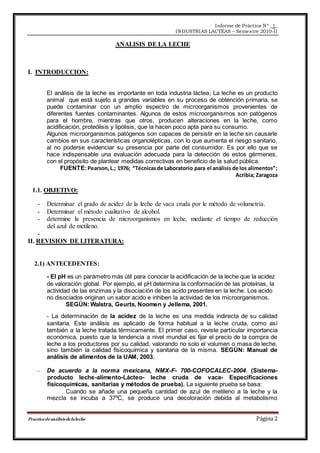 Este informe presenta los resultados de un análisis de leche realizado por estudiantes de ingeniería agroindustrial. El documento incluye la introducción, objetivos, revisión de literatura y marco teórico sobre las propiedades físicas, químicas, microbiológicas y nutricionales de la leche. Los estudiantes determinaron parámetros como el grado de acidez, presencia de alcohol y microorganismos en muestras de leche cruda para evaluar su calidad.
