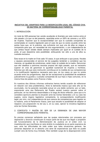 El documento habla sobre la iniciativa del Ararteko (Defensor del Pueblo de País Vasco) para promover una modificación legal que establezca la custodia compartida de los hijos como la opción predeterminada en casos de divorcio o separación cuando ambos padres son aptos, en lugar de otorgar la custodia exclusiva a la madre en la mayoría de los casos. El Ararteko argumenta que la legislación actual se basa en estereotipos sexistas que no promueven la igualdad entre hombres y mujeres ni el derecho de los niños a mantener una relación