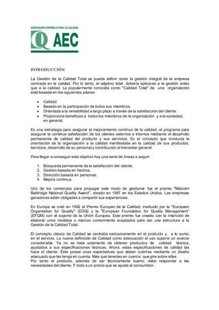 La Gestión de la Calidad Total se centra en la satisfacción del cliente y la mejora continua involucrando a toda la organización. Se basa en nueve criterios como el liderazgo, los procesos, y la satisfacción del cliente y del personal. Los sistemas de gestión de la calidad total siguen el modelo EFQM y premian tanto los procesos como los resultados obtenidos.