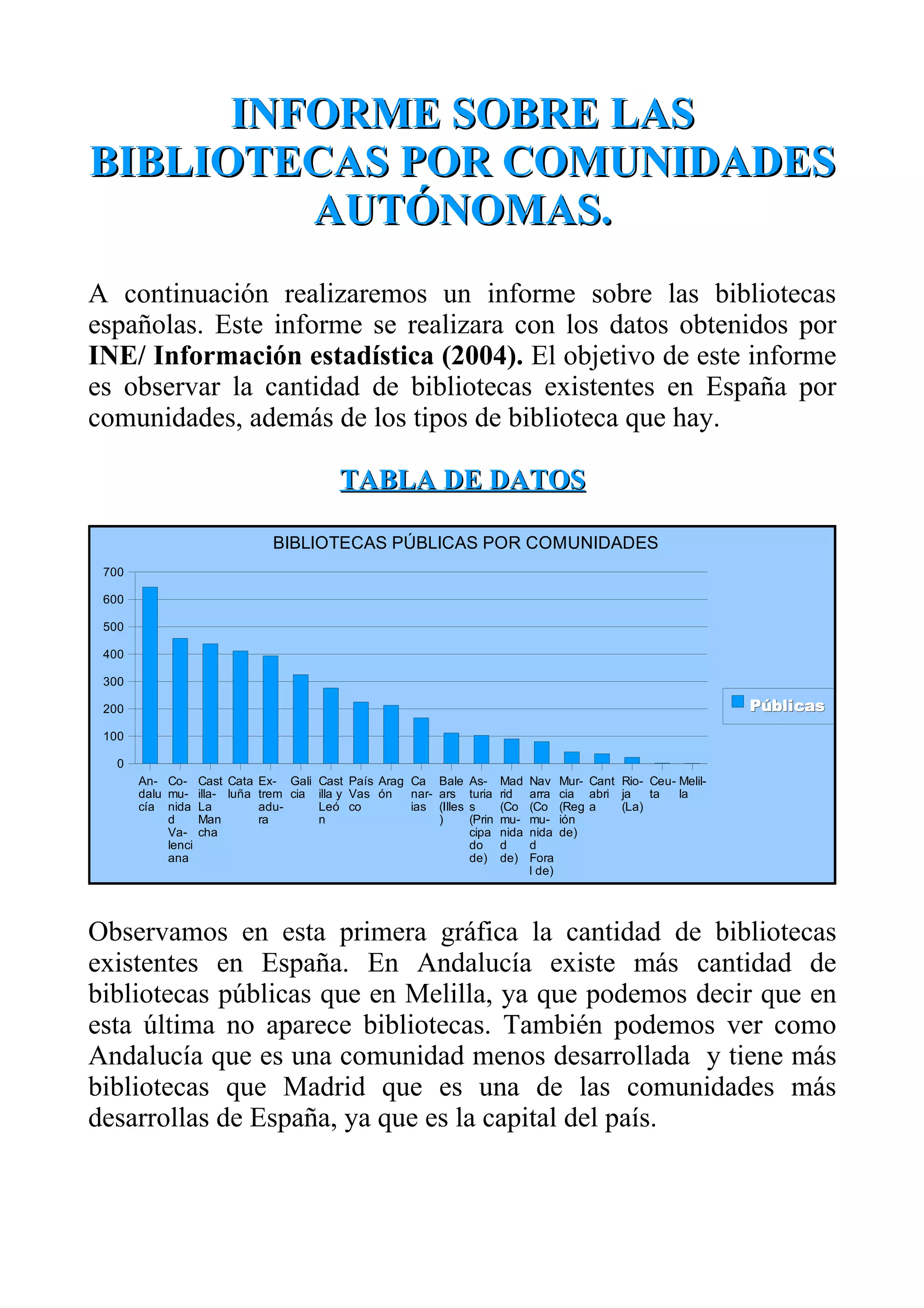 Este informe analiza las bibliotecas en España por comunidades autónomas según tres categorías: bibliotecas públicas, bibliotecas de instituciones de enseñanza superior y bibliotecas especializadas. Andalucía tiene más bibliotecas públicas que Melilla, que no tiene registradas. Cataluña y Madrid tienen más bibliotecas de enseñanza superior y especializadas, mientras que Ceuta y Melilla tienen menos bibliotecas de cada tipo.