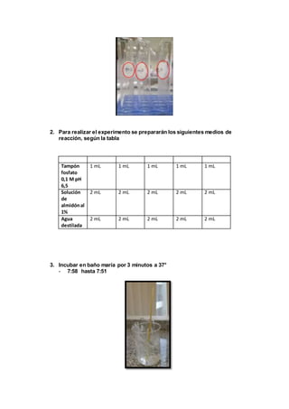 El documento describe un experimento para demostrar cómo la amilasa salival degrada el almidón y cómo la temperatura y el pH afectan esta actividad enzimática. Se prepararon tubos con diferentes condiciones de temperatura y pH y se añadió saliva y almidón. Al añadir lugol, un cambio de color indicó la degradación del almidón por la amilasa. Los resultados mostraron que la amilasa funciona óptimamente a 37°C y pH neutro, mientras que cambios en el pH o la temperatura reducen su actividad.