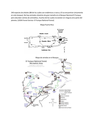 Este informe resume la ecología del Bosque Lluvioso Tropical El Yunque en Puerto Rico. El Yunque alberga una gran diversidad de especies de plantas y animales, incluidas 150 especies de helechos y 240 especies de árboles, muchas de ellas endémicas. El informe describe la ubicación, clima, datos recolectados en senderos y gráficas de variables como temperatura, humedad y viento. Se observa una relación inversamente proporcional entre la temperatura y la humedad.
