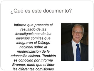 El documento presenta los resultados de investigaciones sobre la modernización de la educación chilena, conocido como informe Brunner. Se enfatiza la importancia de la educación como un derecho fundamental y su papel crucial en la formación de individuos capaces de participar en la vida en común. Se abordan preguntas sobre qué enseñar, cómo educar y quiénes son los responsables de la educación en el contexto de una sociedad en constante cambio.