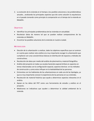 Este documento presenta un análisis de la urbanización Cañaveral en Medellín construida en la década de 1990. Se analizan tres escalas: macro (relación con la ciudad), meso (relación con el entorno inmediato) y micro (unidad de vivienda). A escala macro, se identifican aspectos positivos como su ubicación y conexión con equipamientos, pero también inconsistencias como deficiencias viales. A escala meso, hay aspectos a favor como zonas verdes pero también problemas como escasez de vías. A escala micro,