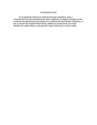 Este documento describe los componentes y tipos de calderas utilizadas en sistemas de recirculación de agua como hatcheries. Explica que una caldera es un recipiente cerrado donde el agua se evapora continuamente mediante la transferencia de calor de gases producidos por la combustión de combustibles fósiles. Detalla los principales componentes de una caldera como el tambor de vapor, caja de secado, tambor de lodos, ventilador, precalentador de aire y economizador. También describe dos tipos comunes de calderas, las acuotub