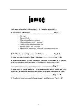 Este documento presenta información sobre el proceso de la enfermedad de la diabetes y los desequilibrios nutricionales por exceso, incluyendo sus definiciones, epidemiología, manifestaciones, complicaciones, y efectos. Describe los cuidados de enfermería requeridos para estas condiciones, incluyendo la prevención, recursos comunitarios, demandas de cuidado, y la educación e información para los pacientes. Finalmente, incluye consejos sobre alimentación y una bibliografía.