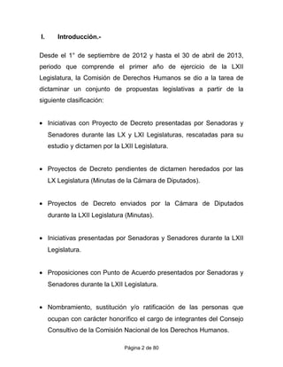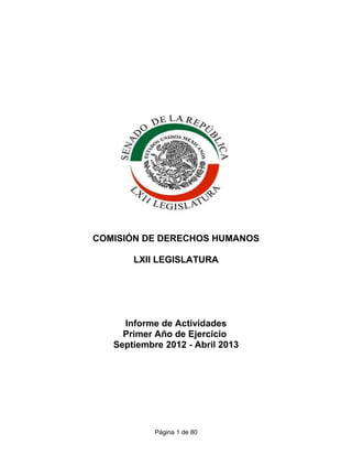 Este documento presenta el informe de actividades de la Comisión de Derechos Humanos del Senado de México durante su primer año de ejercicio de la LXII Legislatura, de septiembre de 2012 a abril de 2013. Resume las iniciativas, minutas y puntos de acuerdo dictaminados por la comisión, incluyendo reformas al Código Federal de Procedimientos Penales y a la Ley General de Víctimas para fortalecer la protección de periodistas y los derechos de las víctimas. También describe los cambios