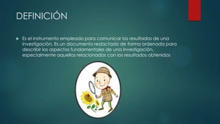El documento define un informe científico como un documento que comunica los resultados de una investigación de manera ordenada. Explica que un informe científico describe los procedimientos y técnicas de la investigación para que pueda ser reproducida y verificada por otros, y provee información para futuras investigaciones. Además, detalla las características y estructura común de un informe científico como precisión, rigurosidad, seriedad científica y secuencia lógica.