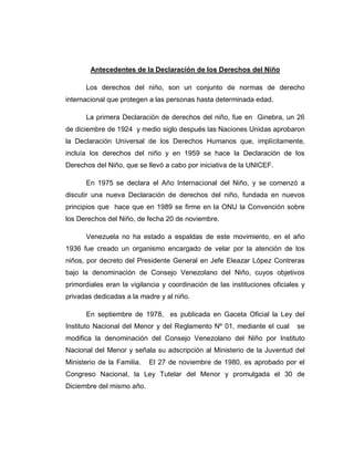 La Ley Orgánica de Protección del Niño, Niña y Adolescente (LOPNA) tiene el objetivo de garantizar los derechos de los niños y adolescentes a través de la protección integral del Estado, la sociedad y la familia. La ley distribuye las responsabilidades de protección entre estas entidades y concibe a los niños como sujetos de derechos. La doctrina de protección integral incluye acciones para garantizar los derechos a la supervivencia, desarrollo y participación de todos los niños.
