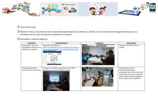 Los docentes de la Universidad Especializada de Las Américas recibieron capacitación sobre el uso de la tecnología m-learning en la plataforma educativa. Aprendieron a conectarse al wifi con sus móviles y a acceder a sus aulas virtuales para resolver dudas de los estudiantes. Se evaluó su aprendizaje con una rúbrica que midió su habilidad para conectar el móvil y trabajar en la plataforma de manera autónoma. Se recomienda que las instituciones capaciten regularmente a los docentes en nue