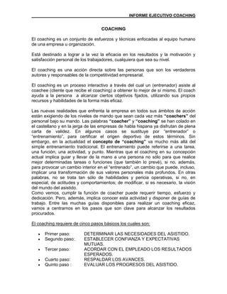 El coaching es un proceso que busca maximizar la eficacia y satisfacción personal de los trabajadores mediante esfuerzos y técnicas dirigidas al desarrollo personal y profesional. Se destaca la importancia de establecer confianza, acordar metas y medir progresos a través de un enfoque interactivo y compartido entre el coach y el coachee. Además, el coaching se diferencia del asesoramiento al enfocarse en el funcionamiento de los equipos y el desarrollo personal, utilizando herramientas que permiten una mejora continua en el desempeño.