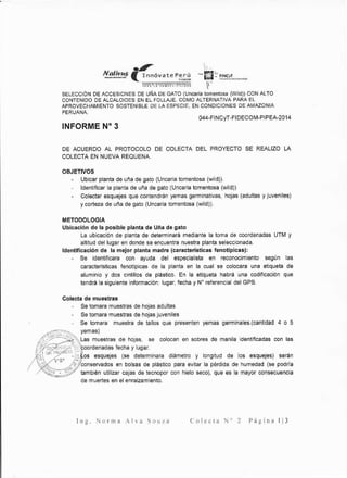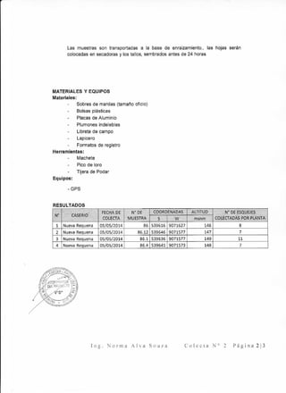 Este documento describe una colecta de muestras de una planta medicinal llamada Uncaria tomentosa en Nueva Requena, Perú. El objetivo era ubicar, identificar y colectar esquejes, hojas y corteza de plantas con alto contenido de alcaloides. Se siguió un protocolo que incluyó tomar coordenadas GPS, etiquetar las plantas seleccionadas, y recolectar y empaquetar las muestras para su transporte y procesamiento posterior. Se colectaron 4 muestras de plantas que podrían ser clones