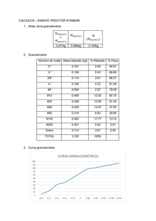 El documento describe los métodos estándar para realizar ensayos de compactación en laboratorio, incluyendo el Ensayo Proctor Estándar desarrollado por R.R. Proctor en 1933. Este ensayo determina la densidad máxima y humedad óptima de un suelo mediante la compactación en capas y golpeo controlado en un molde normalizado. También se menciona el Ensayo Proctor Modificado, el cual usa mayor energía de compactación. El documento proporciona detalles sobre la realización y cálculos de un Ensayo Pro