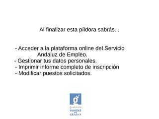 El documento describe cómo acceder a la plataforma online del Servicio Andaluz de Empleo, dónde se pueden gestionar datos personales, imprimir informes de inscripción y modificar puestos solicitados. Se proporciona un enlace para entrar a la oficina virtual y se destaca la importancia de un usuario y contraseña para realizar trámites administrativos relacionados con el perfil de demandante de empleo. Además, se menciona la posibilidad de revisar ocupaciones solicitadas y contactar para dar de alta nuevas ocupaciones.