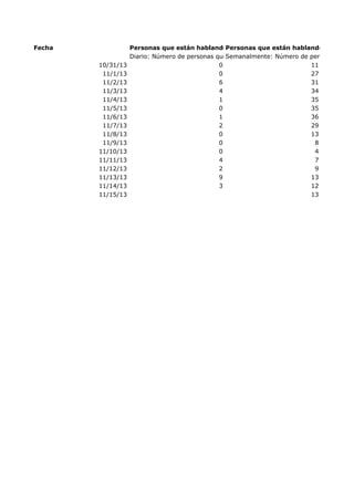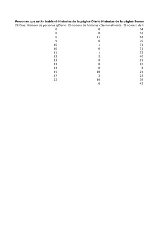 El documento proporciona datos sobre el rendimiento de una página de Facebook durante un período de un mes, incluyendo métricas como el alcance orgánico, las interacciones de los usuarios, las impresiones y las historias compartidas. Se muestran las cifras diarias, semanales y para los últimos 28 días de cada métrica.