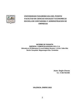 Este informe de pasantía describe las actividades realizadas por el autor en la empresa Comercializadora 2014, C.A. El autor realizó tareas contables como procesar declaraciones electrónicas, verificar facturas, clasificar facturas de compra y venta, y procesar diferentes declaraciones de impuestos. El autor considera que la experiencia le permitió aplicar sus conocimientos de contaduría y fortalecer sus habilidades profesionales.