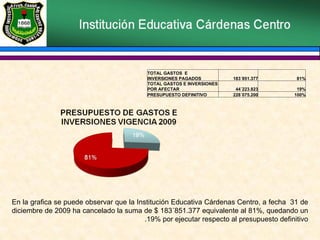 El documento resume los ingresos y gastos de la Institución Educativa Cárdenas Centro para el año 2009. Se recaudaron $204.645.732,71 del presupuesto, dejando $66.062.772 por ejecutar. Los gastos pagados fueron de $183.851.377, dejando $44.223.823 por afectar. La mayor inversión fue en mejoramiento de infraestructura con $109.278.649. Los proyectos incluyeron una aula inteligente, sala de sistemas, sala TIC y bilingüismo, of
